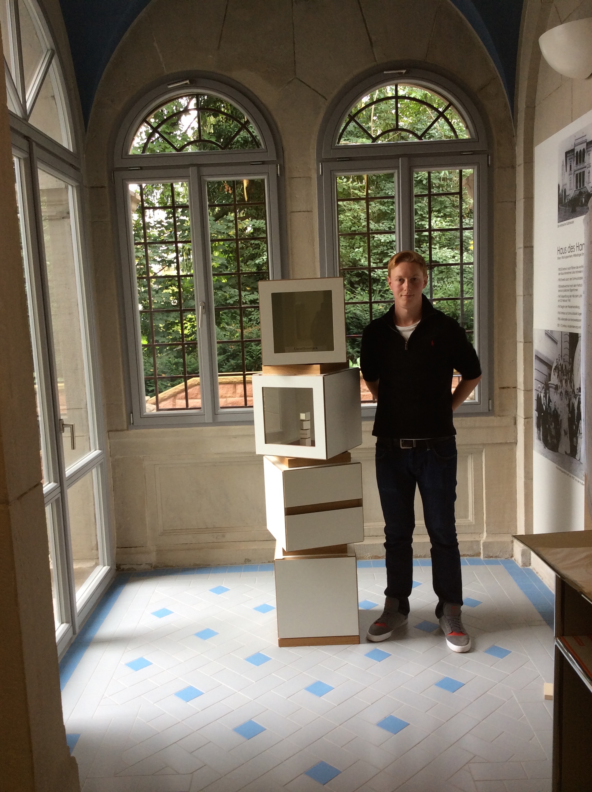 Das Gesellenstück ist aus Multiplex Birke Seidenmatt weiß beschichten und Eiche geölt. Der "Bartower" besteht aus 4 Würfel, die aufeinander gesteckt werden. Die Besonderheit der Würfel ist, dass sie sich 360° drehen lassen. Dies macht ein Selbstentwickelter Drehmechanismus mit Arretierung möglich. Somit kann man dieses Möbelstück von allen Seiten bedienen. Im unteren Korpus befindet sich ein mechanischer Auszug. Hier ist der Flaschen Vorrat vorgesehen. Im nächsten befinden sich zwei von Hand gezinkte Schubladen. Diese dienen für Barzubehör. Alle drei Schubladen sind aus Eiche geölt. Im darauf sitzenden Würfel ist eine Klappe eingebaut mit einem Glasausschnitt. Im Boden des Korpus ist eine Feuerrote Glasplatte Flächenbündig eingelassen. Hier ist Platz für die besonderen Falschen. Der darauf folgenden Korpus ist mit einer Tür versehen. Ebenfalls hat er einen Glasausschnitt. Die Gehrungsbänder wurden Flächenbündig eingelassen. In den Würfel kommen die Gläser. LED Leuchten machen möglich, dass die Flaschen und Gläser beleuchtet werden. Alle Fronten sind auf Gehrung gefräst und somit einschlagend. Durch Intelligente grifffräsungen werden die Forderstücke geöffnet.
